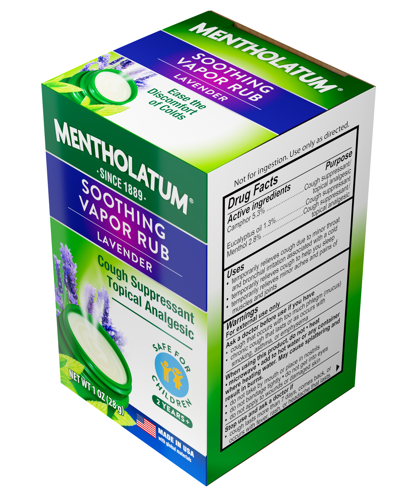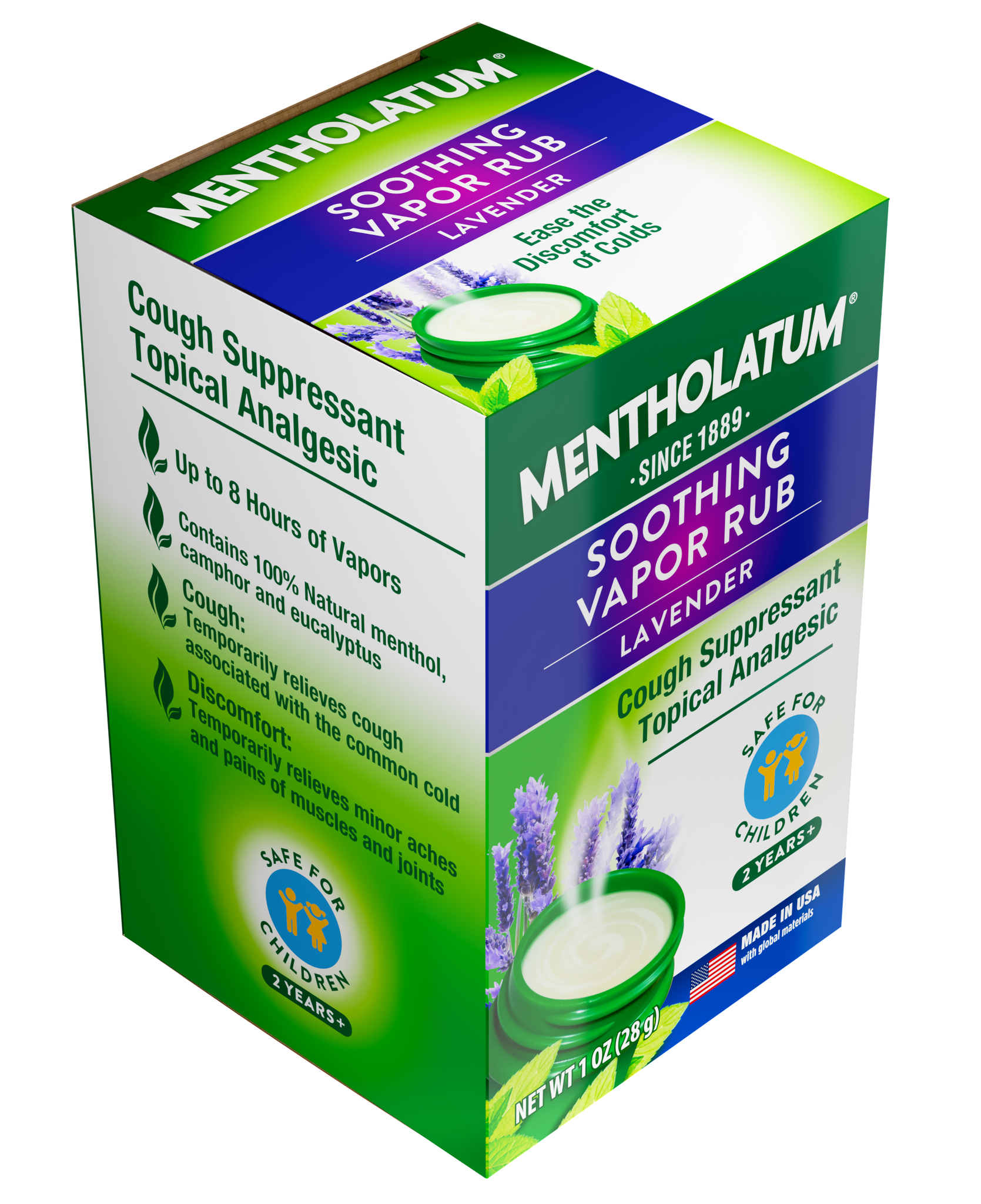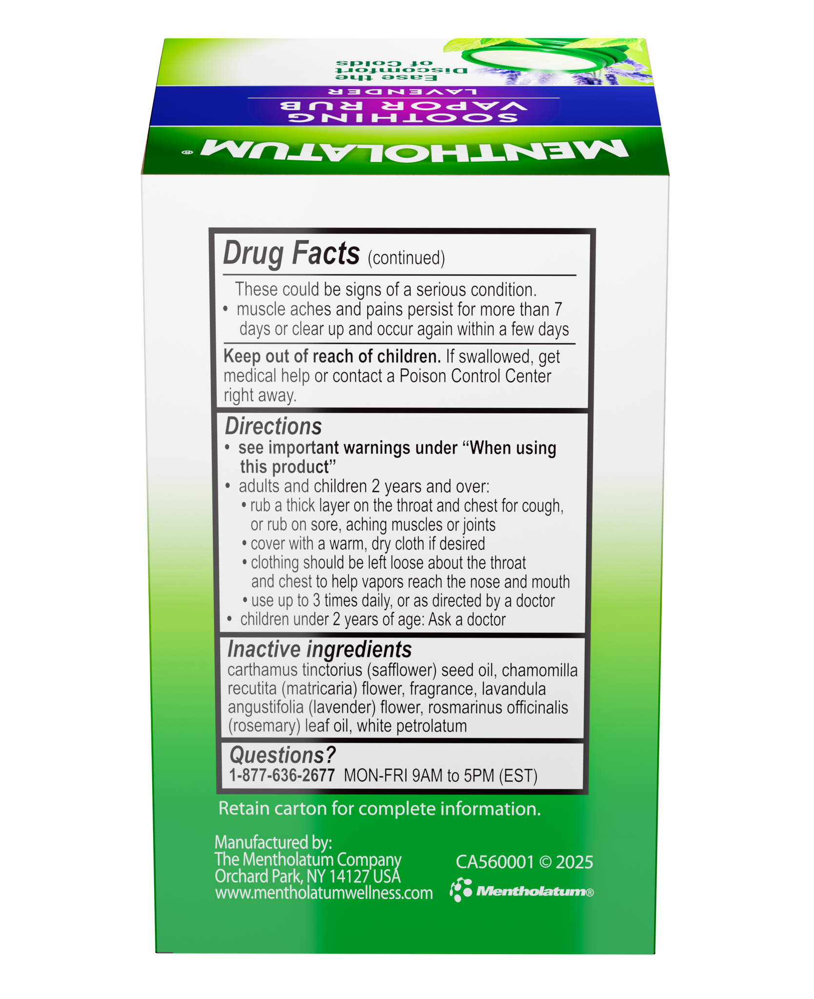 Experience the soothing relief of Mentholatum Soothing Vapor Rub Lavender, a trusted remedy for over a century. Whether you're dealing with chest congestion, nasal congestion, or muscle aches, Mentholatum has you covered. Our ointment is formulated with 100% natural camphor, eucalyptus oil, and menthol, time-tested ingredients known for their soothing properties. Mentholatum Soothing Vapor Rub with a soothing lavender scent delivers medicated vapors that temporarily relieve cough to help you or your child sleep – so you can both get the rest you need. Mentholatum Soothing Vapor Rub Lavender is incredibly versatile. Simply apply it to your chest, throat, or neck, to relieve aches and pains and ease discomfort. You can also use it to soothe sore muscles and joints. It's the all-in-one solution for your family's well-being. When you choose Mentholatum, you're choosing a trusted brand that has been a staple in family care for generations. We take pride in using high-quality ingredients and a time-tested formula to ensure your comfort and satisfaction. Try all of our Mentholatum products including Mentholatum VaporDuo, Mentholatum Original Topical Ointment Rub, and Mentholatum No-Mess Vaporizing Rub which is great for children and experience the relief that countless families have trusted for years. Breathe easy and feel better with Mentholatum. FSA eligible. Use as directed.