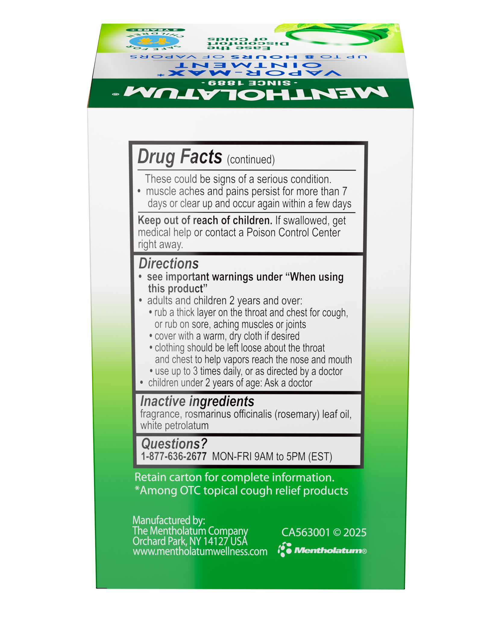 Mentholatum has been trusted since 1889, offering high-quality, time-tested formulas that support your family’s wellness. Try our full line of vaporizing rubs including Mentholatum VaporDuo, Mentholatum Original Topical Ointment Rub, and Mentholatum No-Mess Vaporizing Rub—great for kids and easy to apply. FSA eligible. Use as directed.
