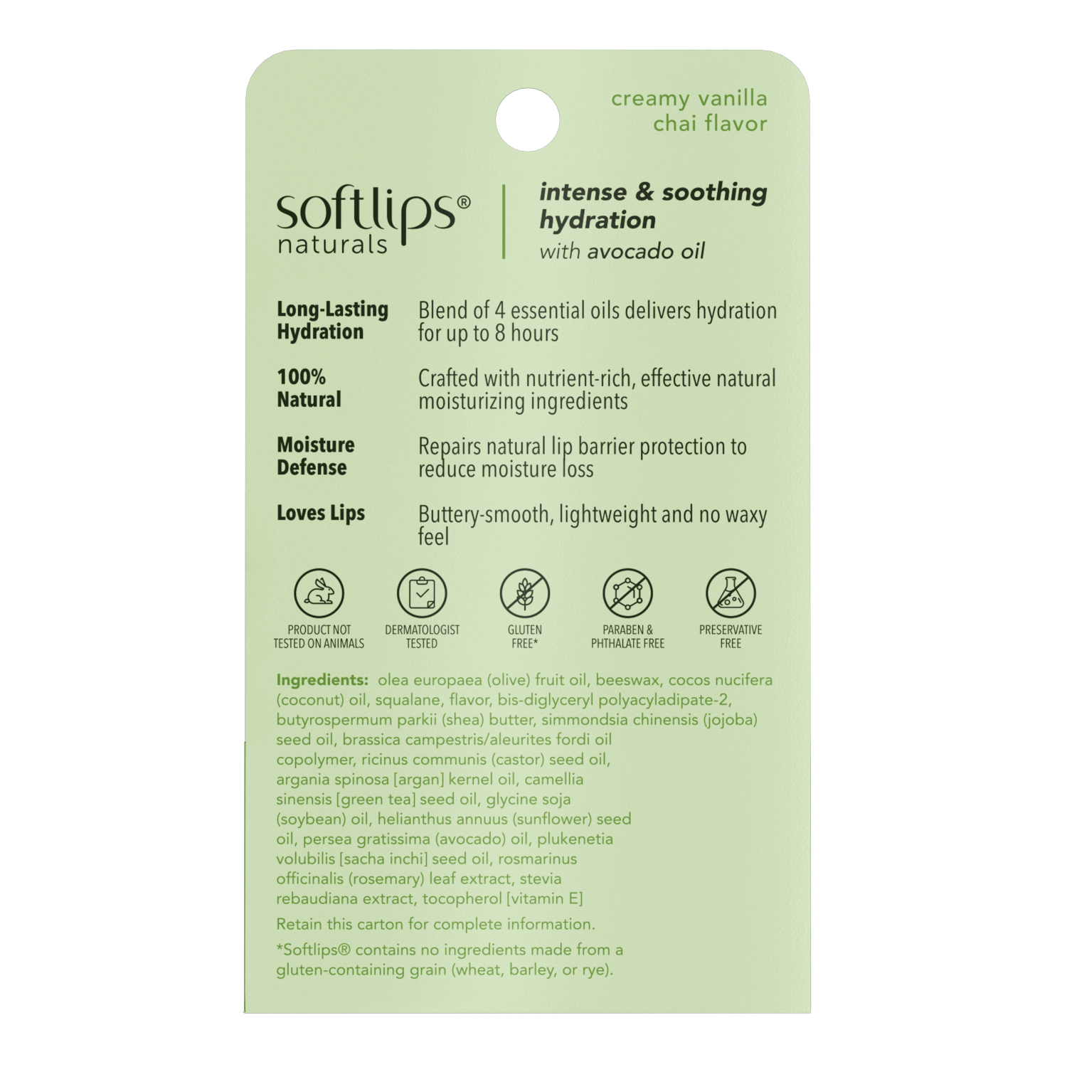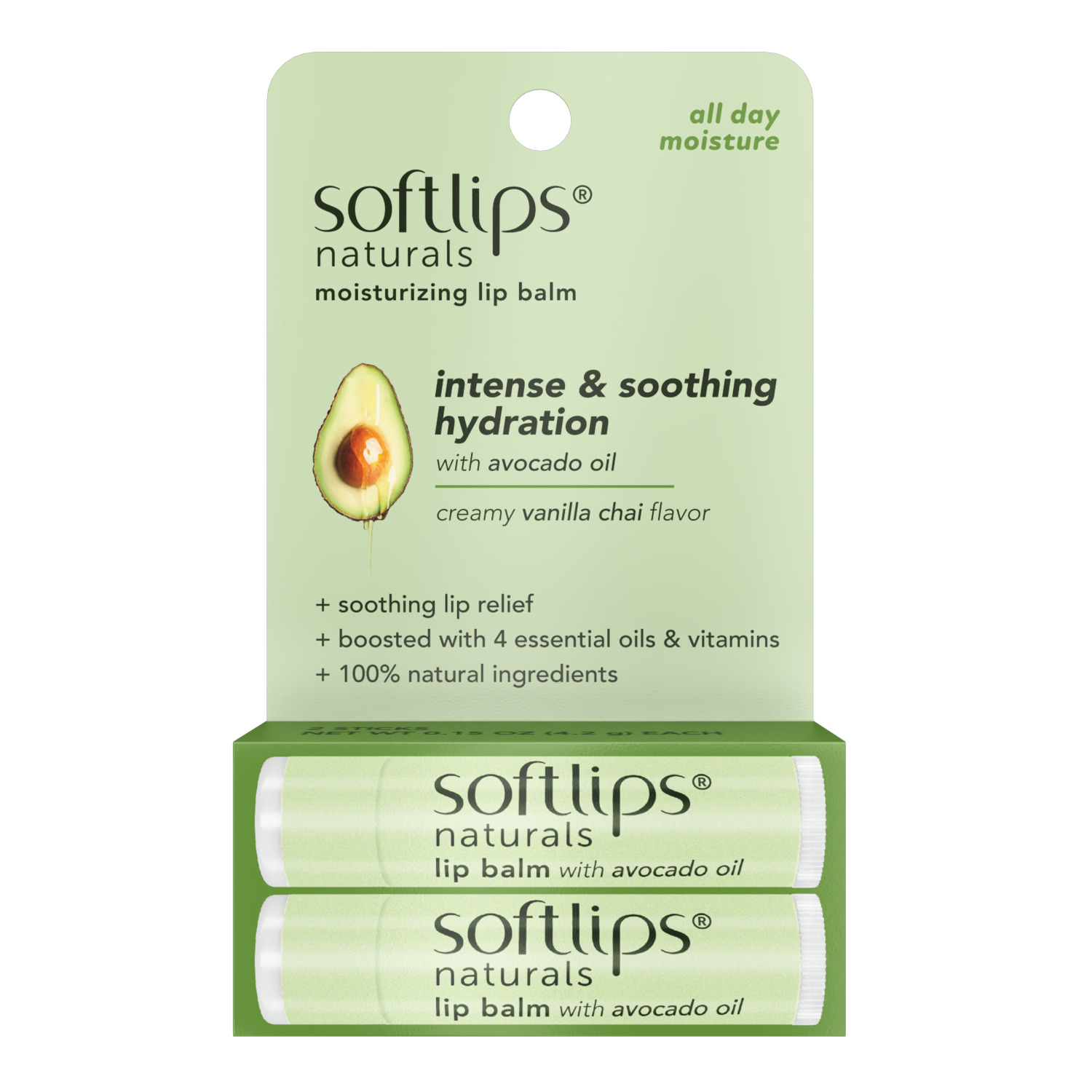Softlips® Naturals contains a unique combination of plant-based oils that deliver up to 8 hours of hydration. Avocado oil is high in omega-9 fatty acids that help increase absorption to promote intense hydration. In addition to hydration, Softlips® Naturals made with Avocado Oil also contains vitamin E, an antioxidant that helps soothe the lips.